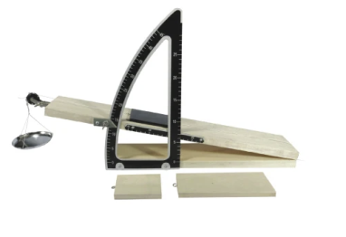 шкива (закрепленного на рейке) диаметром 4 см-1шт, чашки для груза- 1шт, бруска из дерева с 3-я отверстиями для грузов, размер не менее (ДхШхВ) 12х6х3см -1шт, деревянного катка со скобой, размеры катка не менее: ширина 7 см с диаметр 3 см-1шт, нить — 2 метра, линейка 30 см-1шт.